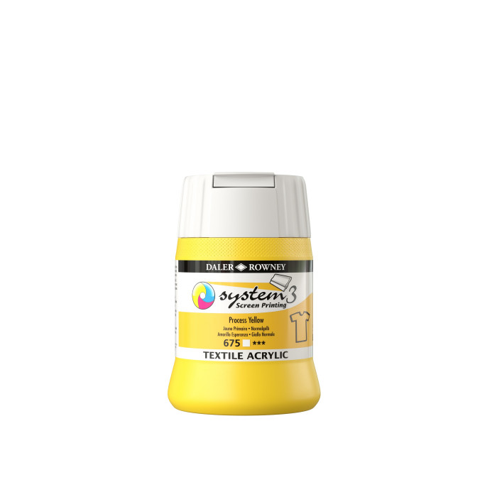 Daler-Rowney Screen Printing Acrylic Inks are highly pigmented, ready-to-use inks. They provide excellent colour strength and lightfastness. Daler-Rowney System3  Heavy Body Acrylics' rich pigmentation gives the strong clear colour definition demanded by professional printmakers. System3 Screen Printing Acrylic Inks have been developed to be ready for use straight from the pot or can be thinned further with screen printing medium should it be desired. The inks have been designed to permit longer working time on the screens and avoid blocking during print runs. They have optimal consistency for screen printing applications.